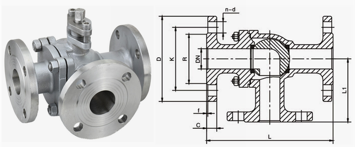 L型三通法蘭球閥主要由閥體、閥蓋、閥座、閥芯、閥桿和操作機(jī)構(gòu)等組成,其閥芯是連通了兩個(gè)垂直交叉成90度方向的流體通道,形狀呈L型,該閥主要用于管路中介質(zhì)流向的切換,中間的通道作為公共端,可連接另外兩端的任一通道(即能夠使相互垂直的兩個(gè)流道連通),還可以同時(shí)斷開(kāi)(關(guān)閉)所有的流體通道,但是不能用于兩側(cè)通道的連通。